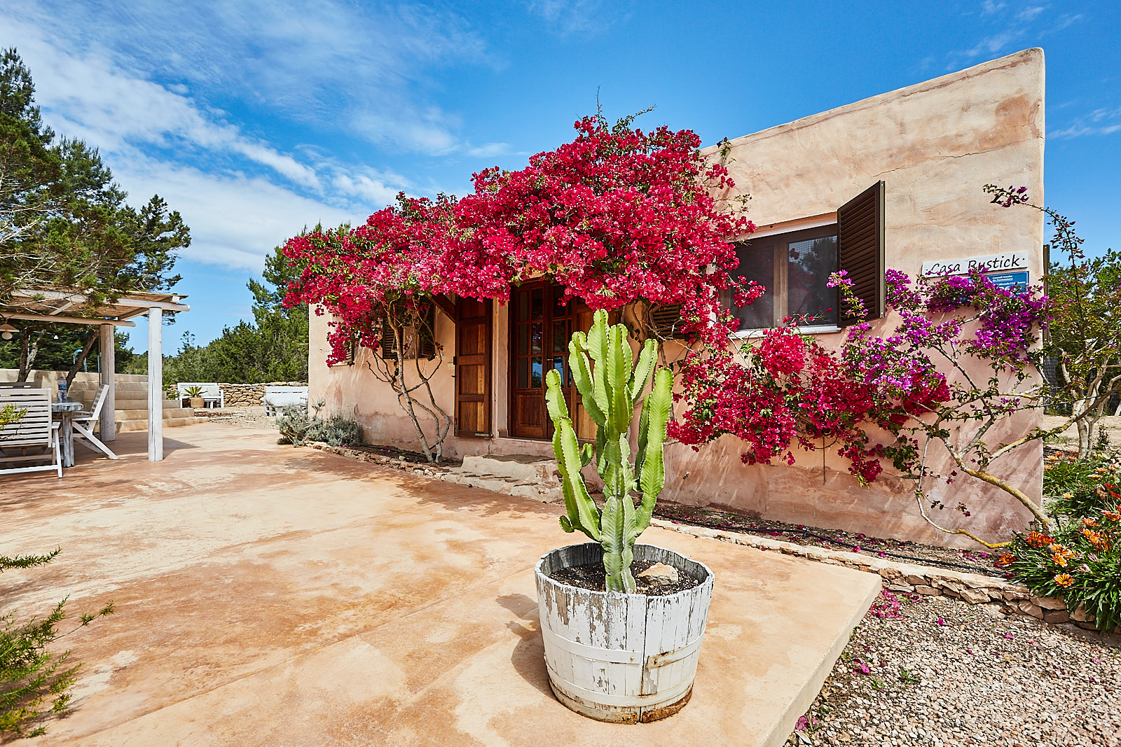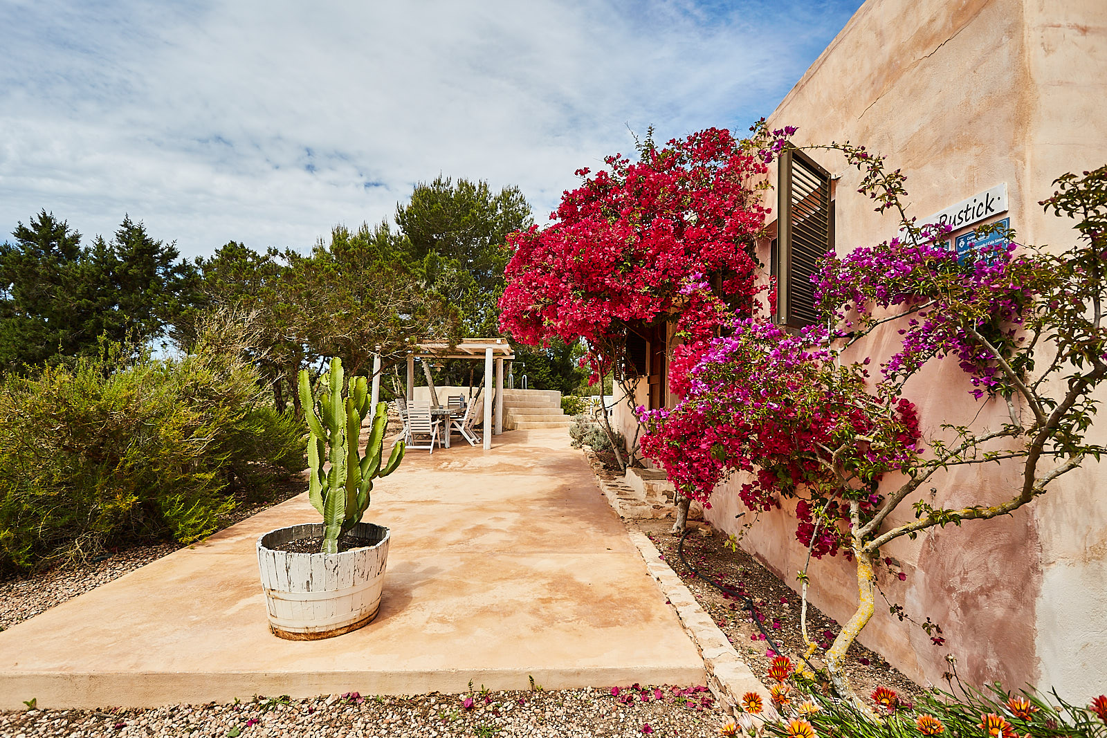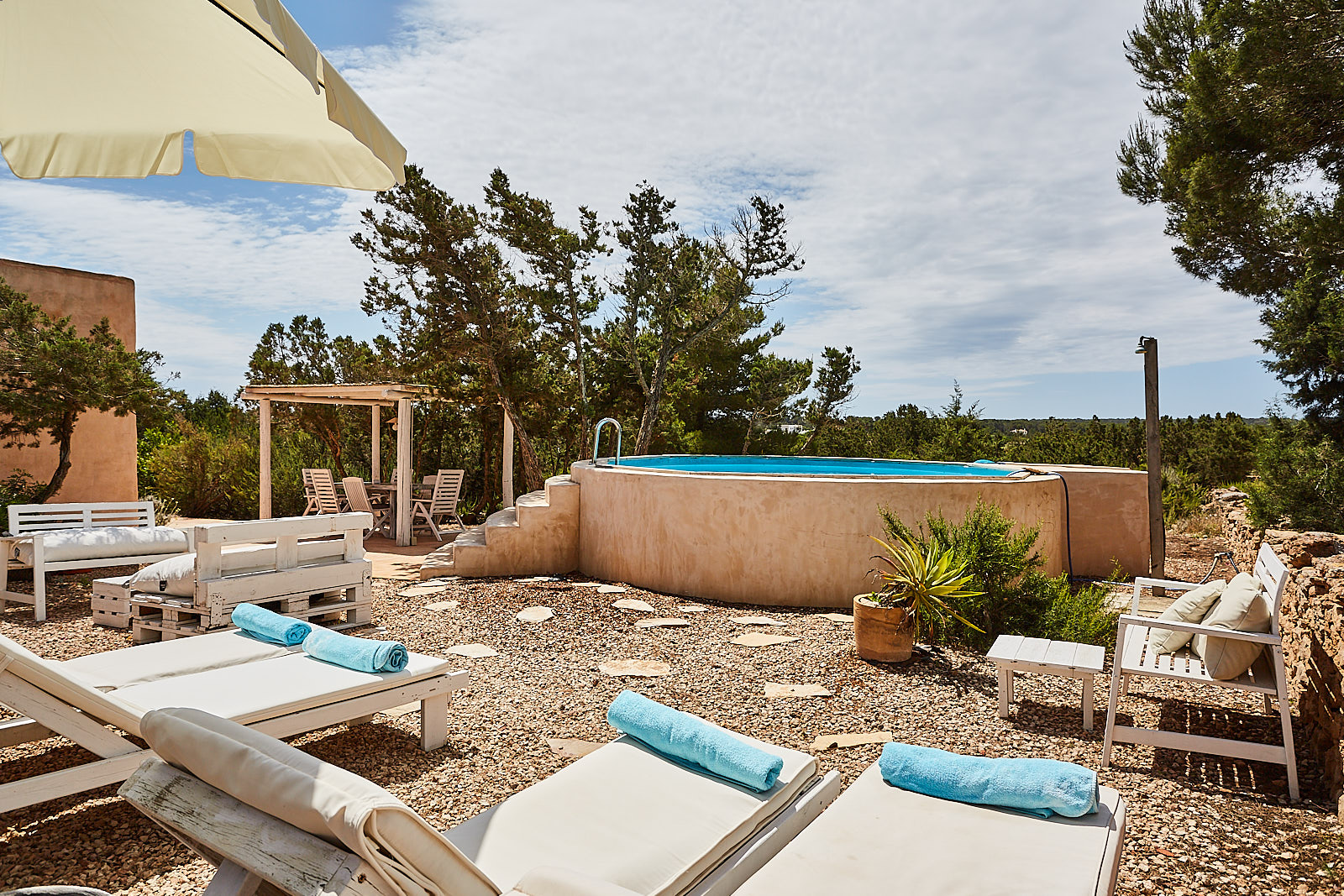 Casa Rustick is a beautiful villa located between Sant Francesc and Cala Saona. The house has 3 bedrooms, one with double bed and the other with single beds, kitchen and two bathrooms. You can also enjoy an outdoor area with swimming pool, barbecue and porch for pleasant dinners. Ideal for families and groups of friends who want their accommodation to be part of the experience to enjoy on the island. The house is carefully integrated into the area in which it is located. Its peasant walls and surroundings with fig trees, pines, junipers and aromatic plants will help you experience this place designed for you to disconnect and enjoy this beautiful island.