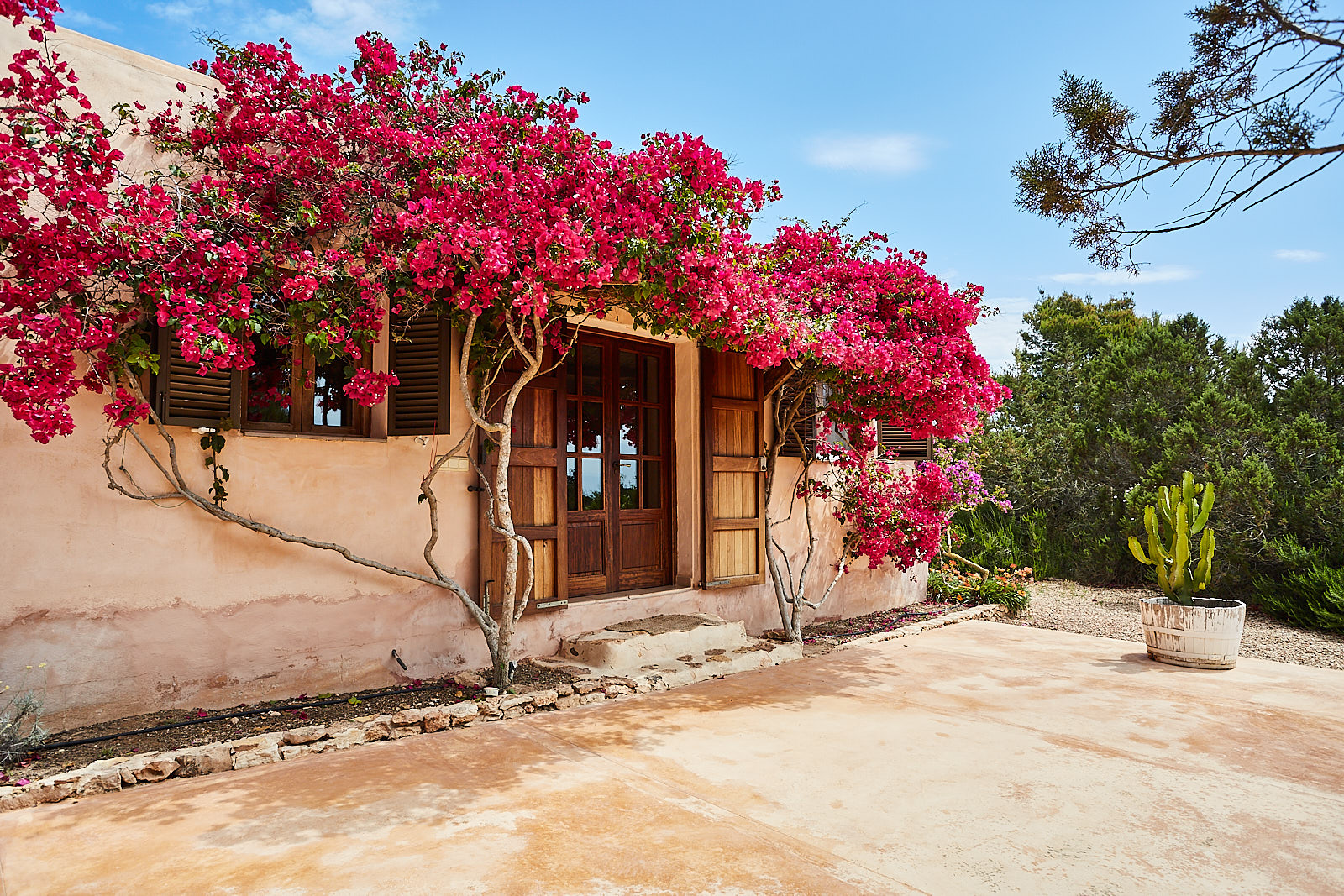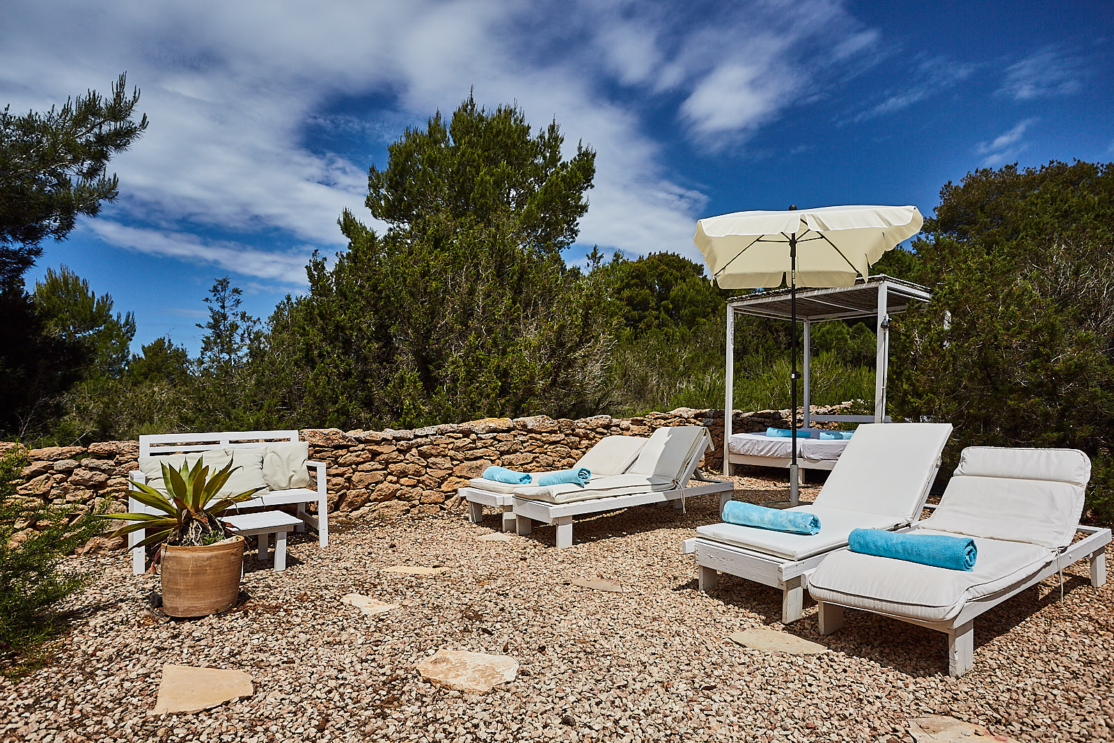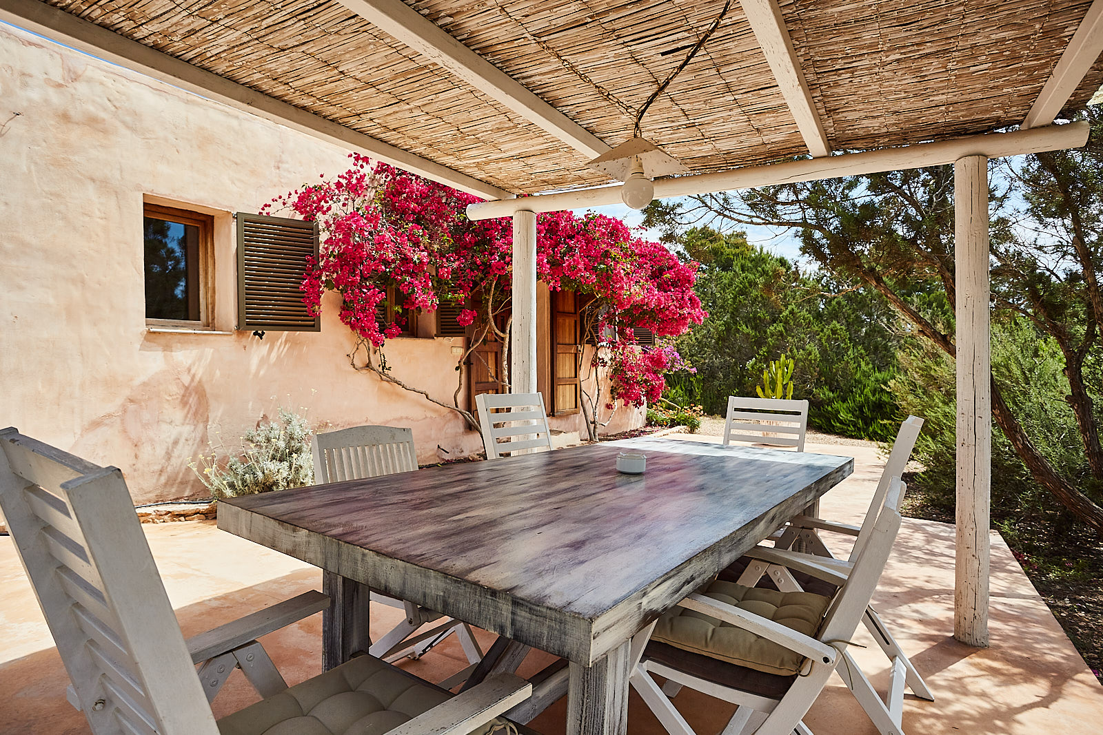 This accommodation in Formentera is a 5-minute drive from the beautiful Cala Saona. The intense turquoise color of its waters inevitably stands out before your eyes, especially with the contrast with the white of its fine sand, the intense green of the lush forests that surround it and the tile color of the land and its topography, making it one of the most charming coves on the island as well as an exceptional place to enjoy the sunset.